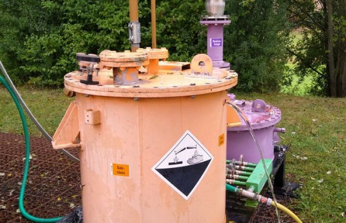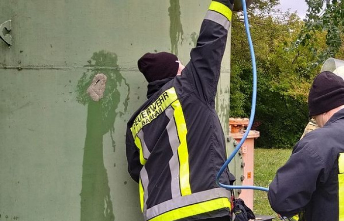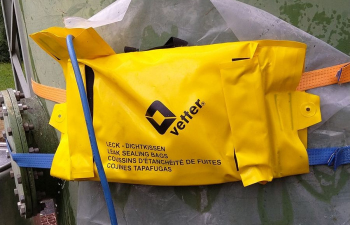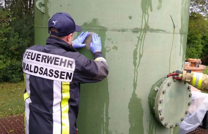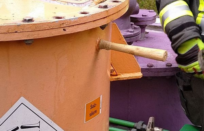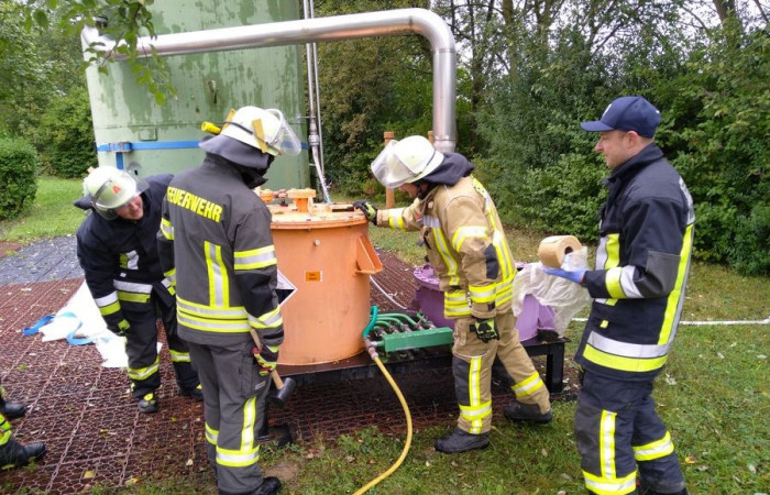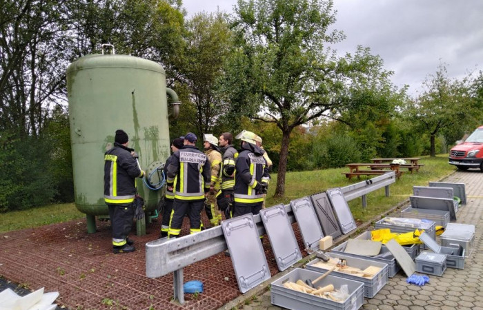 Lehrgangsleiter Dr. Klaus Helm und die Ausbilder Fritz Leicht, Fabian Keppler-Stobrawe sowie Felix Dubrowski, führen die Teilnehmer durch zwei spannende Tage. An der Übungsanlage der Feuerwehr Arzberg (Oberfranken) konnte das umfangreiche Material der Unterstützungsgruppe Gefahrgut des Landkreises Tirschenreuth praktisch eingesetzt werden. Je nach Größe der Leckage bieten sich andere Hilfsmittel an. Genügt bei kleinen Rissen oder Löchern ein Spezialklebeband, das bis zu 12 bar Gegendruck standhalten kann, wurde bei größeren Leckagen ein Leckdichtkissen oder ein Keil verwendet, um den Flüssigkeitsaustritt zu verhindern oder zu minimieren.