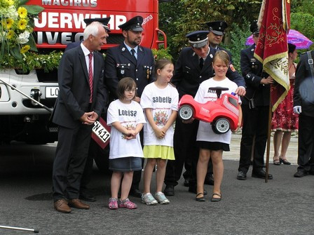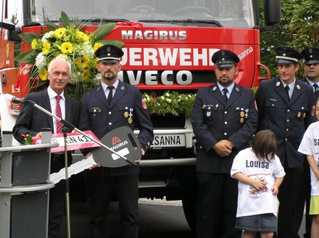 An die Einsatzkräfte der tschechischen Partnerstadt Skalná gerichtet, wünschte er ihnen viel Erfolg und eine glückliche Heimkehr. Für das 29 Jahre alte und außer Dienst gestellte Löschgruppenfahrzeug LF 8 übergab er den Schlüssel an Bürgermeisterin Rita Skalova.