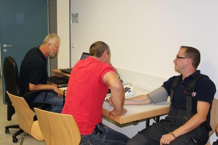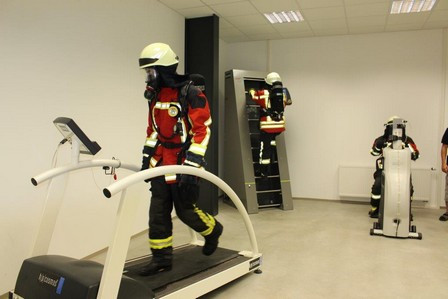 Die bestens vorbereiteten Ausbilder um KBM Harald Würner empfingen die beiden ersten Feuerwehren aus dem Landkreis Tirschenreuth. Nach der obligatorischen Blutdruck- und Pulsmessung erfolgte im Schulungsraum eine kurze Einweisung mittels einer Präsentation. Jeder Teilnehmer legte einen Brustgurt für die Messung der Herzfrequenz an. Mittels eines Transponsers am rechten Handschuh meldeten sich die Teilnehmer an den einzelnen Geräten bzw. anschließend am Übungsraum an. Durch diese Ausstattung ist gewährleistet, dass das Leistungsvermögen der einzelnen Übungsteilnehmer ständig überwacht wird. Im Leitstand haben die Ausbilder nicht nur den gesamten Übungsraum ständig im Blick, auf dem Monitor werden auch die aktuelle Herzfrequenz und die Ist-Leistungswerte von jedem Teilnehmer angezeigt. Nach Abschluss eines Durchgangs erhält jeder Teilnehmer einen Ausdruck mit seinen persönlichen Werten. Bereits jetzt ist klar, das neue gemeinsame Atemschutzzentrum Nordoberpfalz ist ein Gewinn für alle Atemschutzgeräteträger im Landkreis Tirschenreuth. Diese Atemschutzübungsstrecke bietet völlig neue Möglichkeiten bei der Aus- und Fortbildung der Atemschutzgeräteträger.