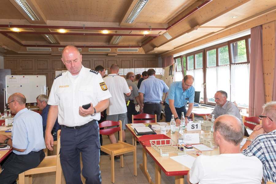 Von der Regierung der Oberpfalz waren die Herren Michael Iberer und Thomas Bahlcke anwesend. Fachbereichsleiter Hans-Christian Eibl und sein Team von der SFS Geretsried hatten ein Szenario ausgearbeitet, bei dem ein Kran auf einen mit Ammoniakwasser beladenen Tanklastzug stürzte.