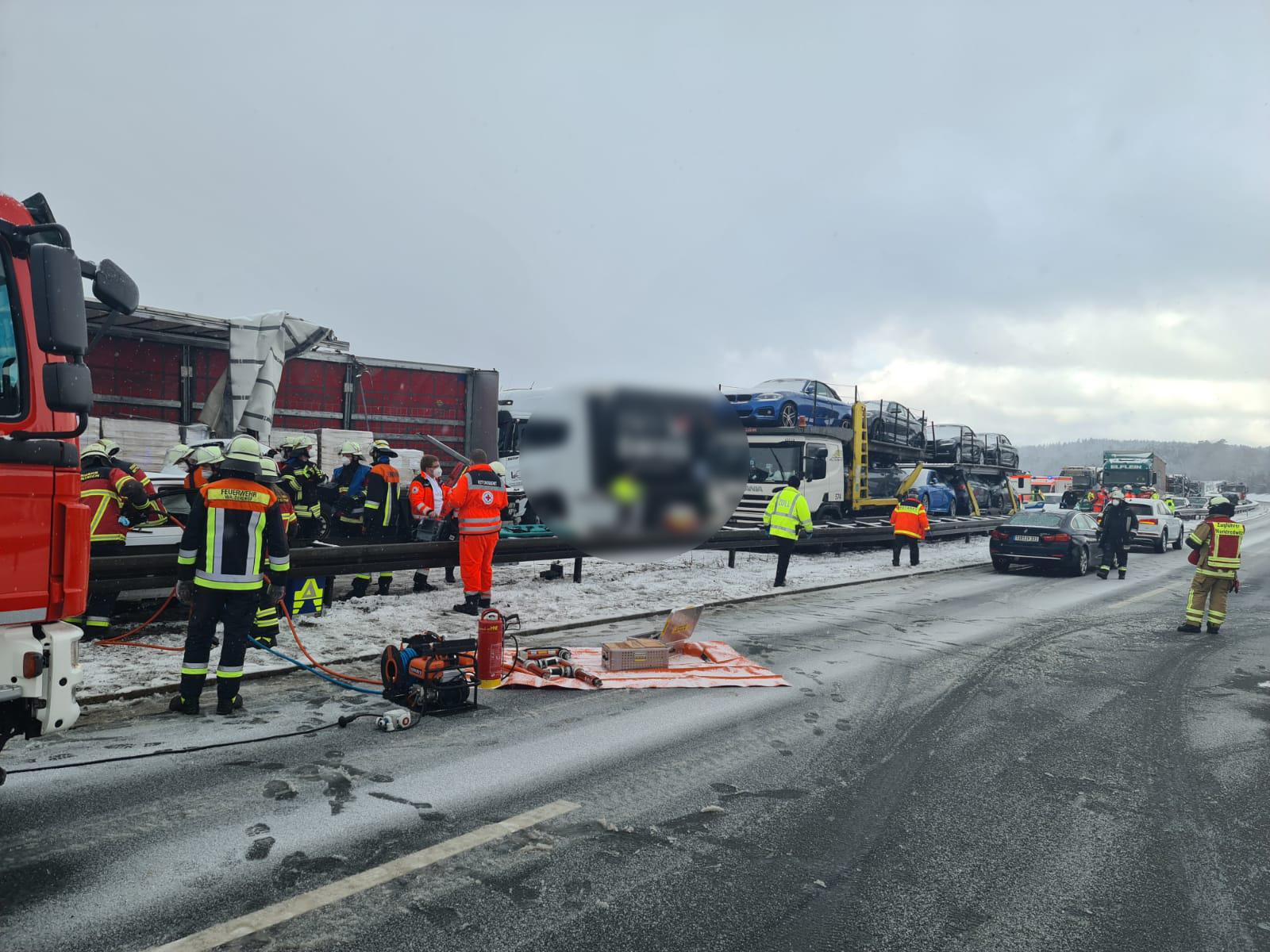 Da Trümmerteile auf die Gegenfahrbahn geschleudert wurden, veranlasste die Polizei eine Vollsperrung der Autobahn. Der Verkehr staute sich daraufhin kilometerlang in beide Fahrtrichtungen.