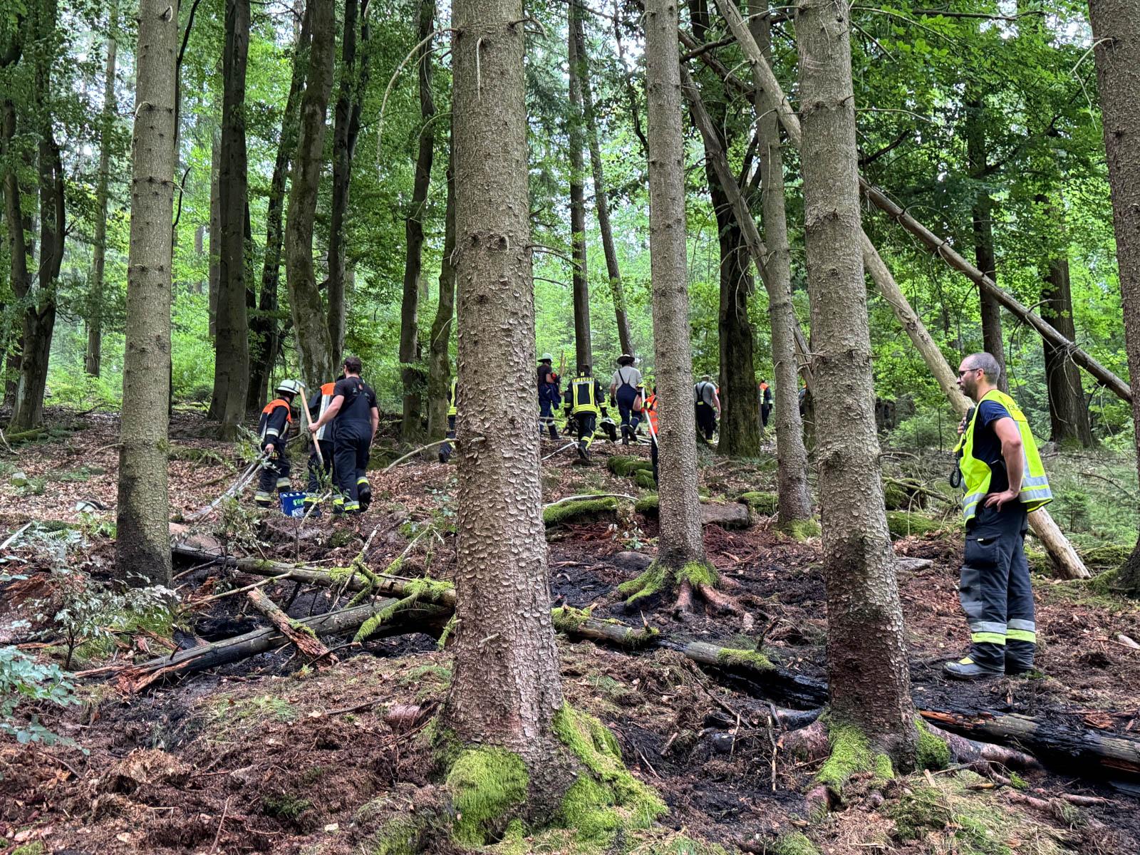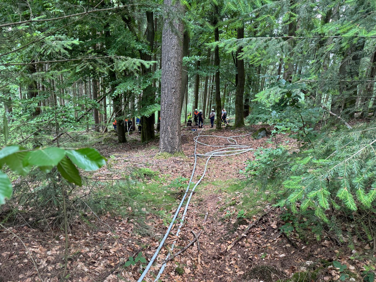 Da sich die Brandstelle etwa 800 Meter abseits von befahrbaren Wegen befand, wurde eine lange Schlauchleitung von den Löschfahrzeugen zur Brandstelle verlegt und die offenen Flammen abgelöscht.