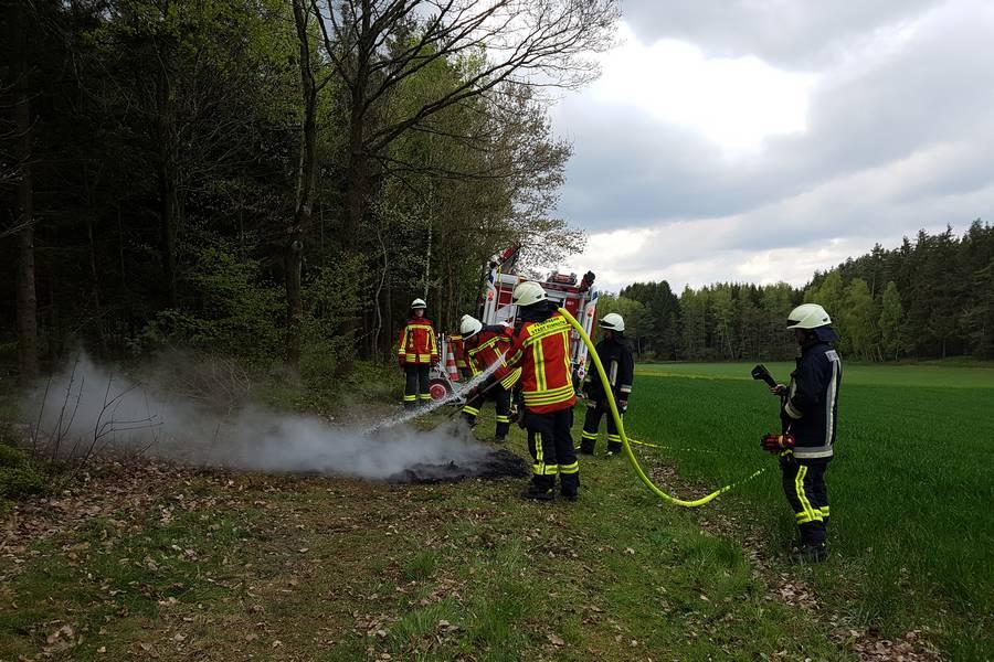 Ein aufmerksamer Bürger meldete am Montag, 8. Mai gegen 15 Uhr über Notruf den Brand eines Gebüsches in einem kleinen Waldgebiet zwischen Eisersdorf und Neusteinreuth. Die Integrierte Leitstelle Nordoberpfalz verständigte die Feuerwehr Kemnath, die den brennenden und glimmende Holzabfallhaufen auf dem Feldweg, der direkt an das Waldstück angrenzt, schnell löschte und mit der Wärmebildkamera nachkontrollierte.