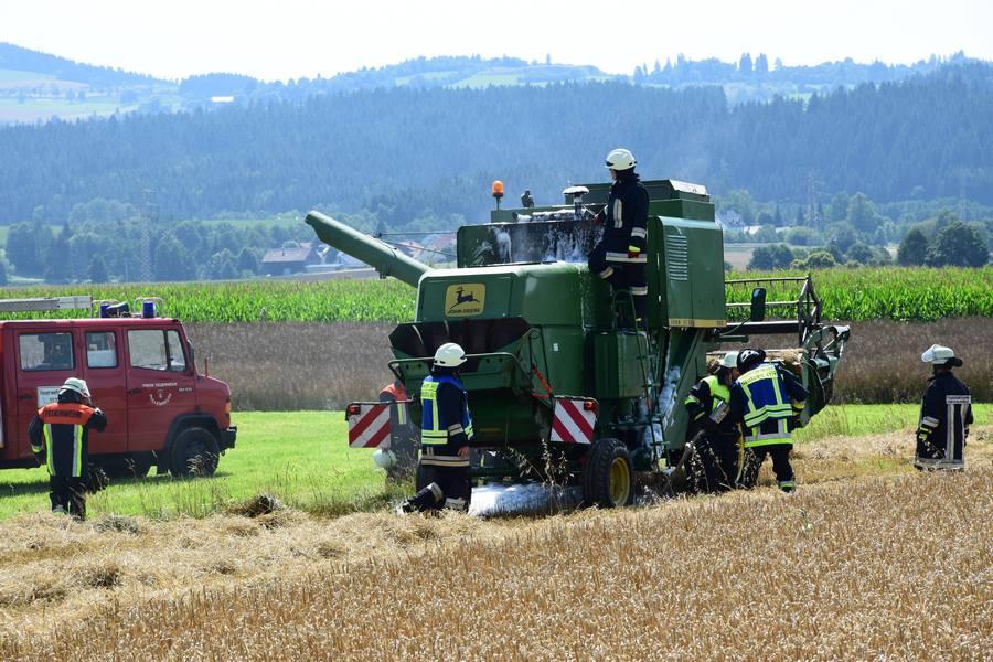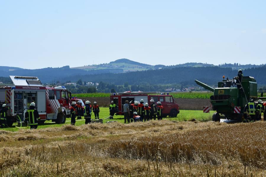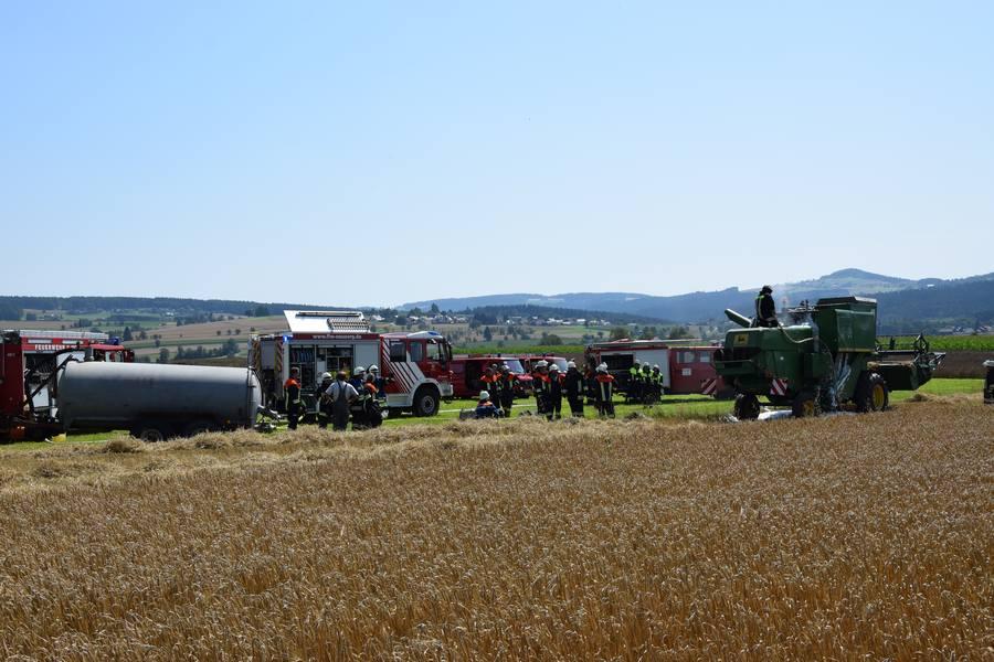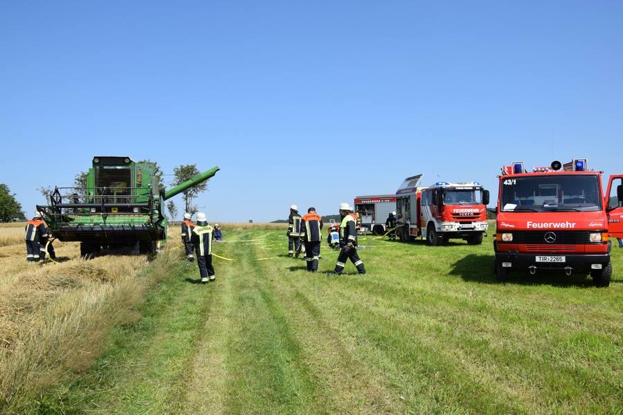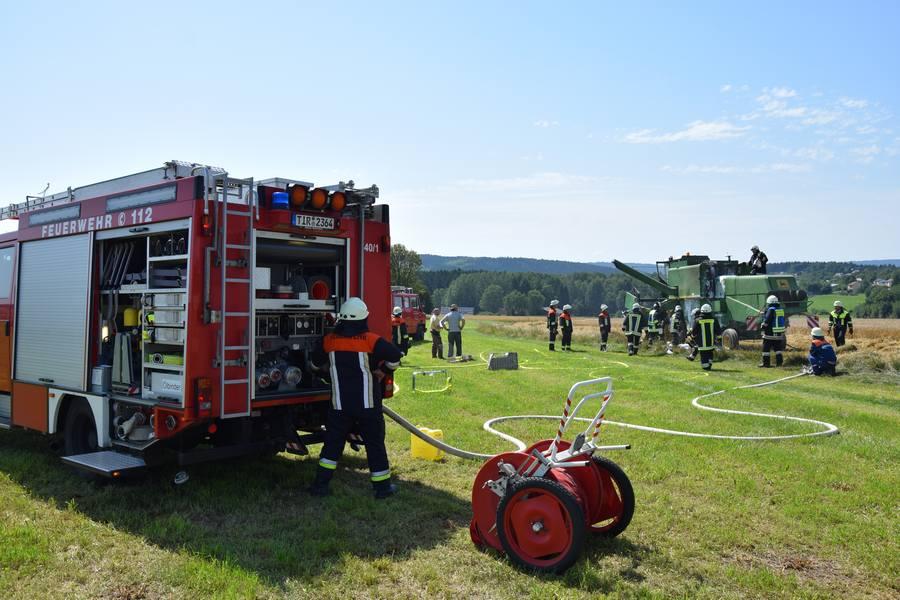 Mit mehreren C-Rohren im Umfeld des Mähdreschers, sowie der Vornahme einer Mittelschaumrohrpistole zur Brandbekämpfung des Mähdreschers selbst, konnte das Feuer rasch abgelöscht werden. Zur weiteren Vorsicht wurde ein Landwirt mit einem Güllefass angefordert. Mit einem speziellen Übergangsstück konnten die Brandschützer dann mit den Schläuchen das Wasser direkt aus dem Pumptankfass entnehmen und so großflächig das Umfeld der Brandstelle einwässern.