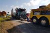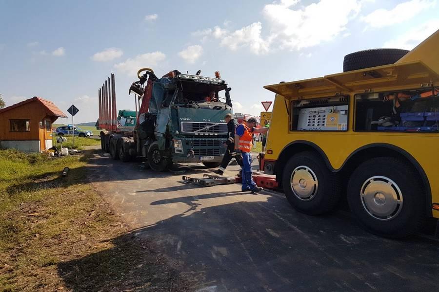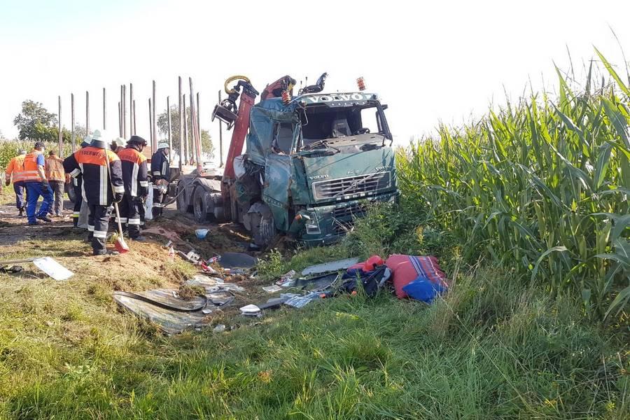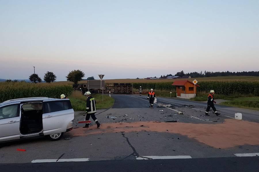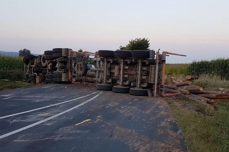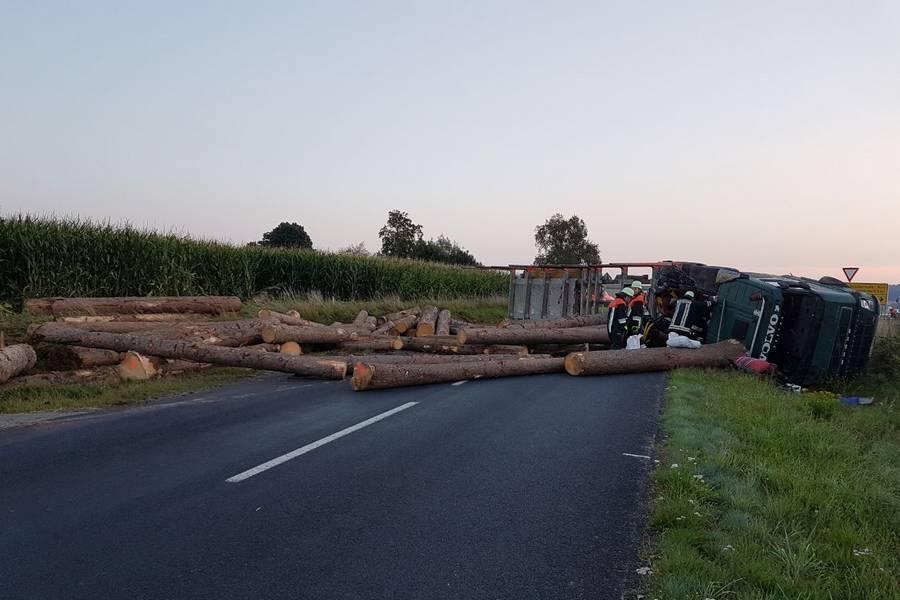 Als der Langholztransporter praktisch die komplette Straße blockierte, konnte der 21-jährige Pkw-Lenker aus dem Landkreis nicht mehr ausweichen und fuhr in die Seite des Auflegers. Das Fuhrwerk kippte um und verteilte seine schwere Last - vier Meter lange Baumstämme - auf der Straße, im Straßengraben und in einem angrenzenden Maisfeld. Beim Aufprall entstand am Ford C-Max des Unfallgegners Totalschaden. Der junge Mann wurde vorsorglich ins Krankenhaus Tirschenreuth gebracht. Der Aufwand an Großgerät, um den Lastwagen und dessen Ladung zu bergen, war enorm. Als erstes wurde der Pkw abtransportiert. Dann wurden die Holzstämme, die für ein Sägewerk in Stein bestimmt waren, auf ein anderes Langholzfuhrwerk umgeladen und an ihren eigentlichen Bestimmungsort gebracht. Schwieriger gestaltete sich das Aufrichten des 40-Tonners, dessen Auflieger quer über der Straße lag. Die völlig demolierte Zugmaschine war im Straßengraben liegengeblieben. Mit schweren Bergungsfahrzeugen wurde der Schwerlaster zurück auf die Straße gestellt und konnte von dort im Schlepptau abtransportiert werden.