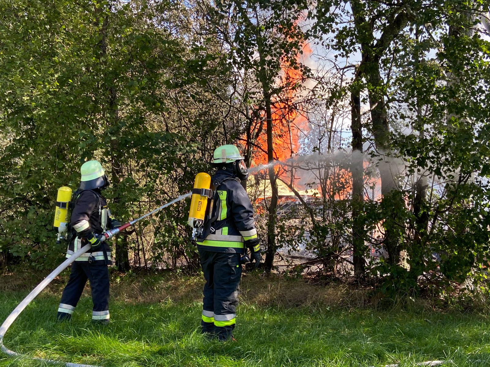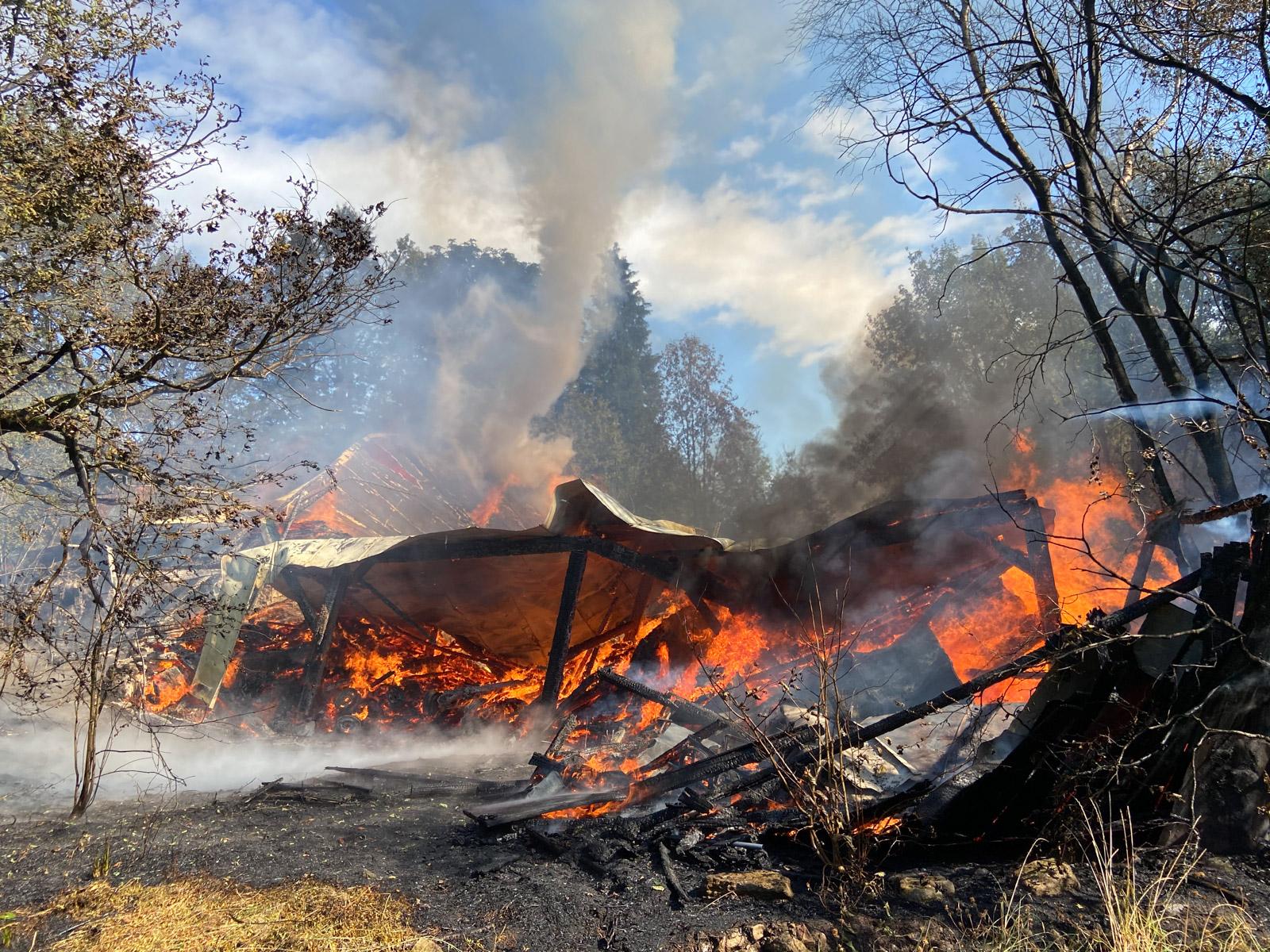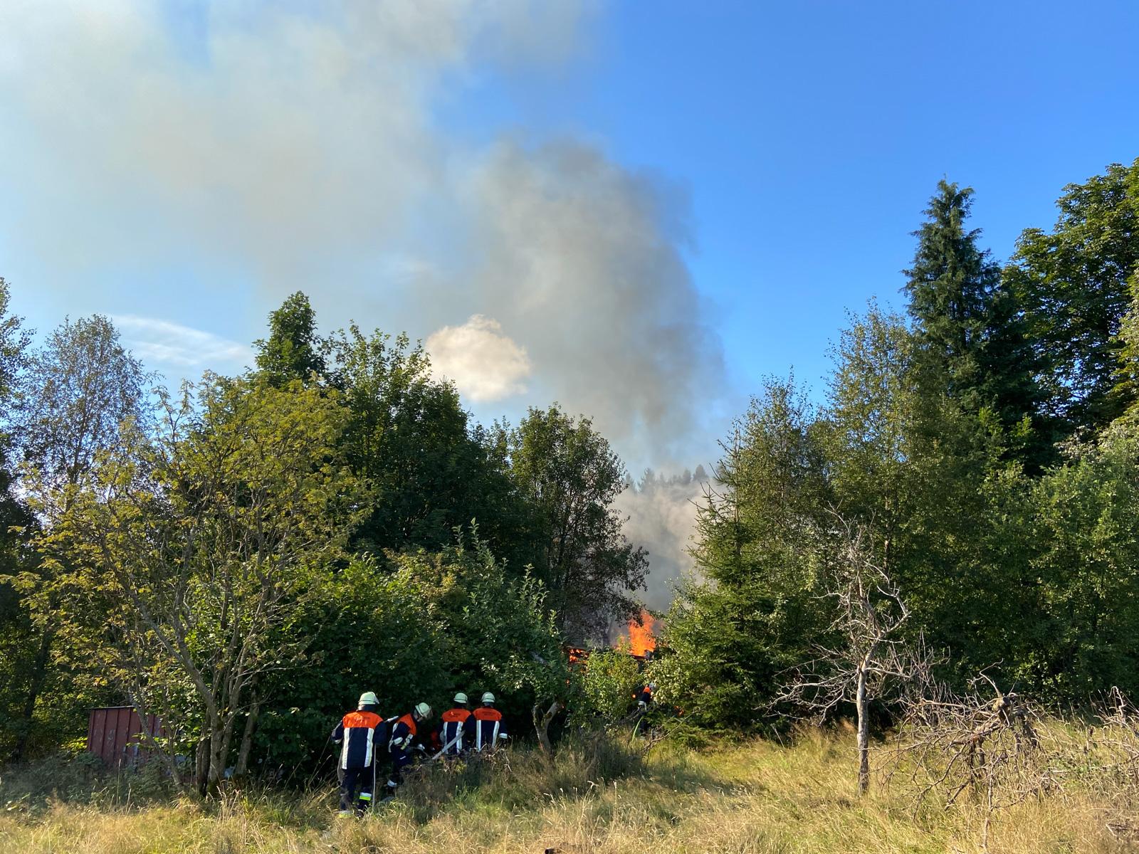 Da zu dem eingewachsenen Gebäude keine befestigte Straße mehr führt, rückten die Einsatzfahrzeuge der Feuerwehr über die angrenzenden Wiesen an. Die Löschwasserversorgung wurde auch mit Güllefässern sichergestellt.