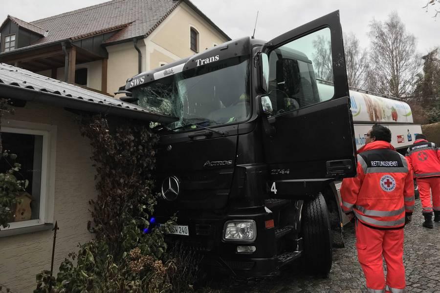 Vor Ort in Dobrigau stellte sich die Lage aber als nicht so schlimm heraus. Der Fahrer eines Milchlaster hatte bei der Anfahrt zu einem Bauernhof auf dem Kopfsteinpflaster die Kontrolle über seinen Lastwagen verloren. Das Gefährt krachte gegen eine Garagenmauer. Der Fahrer verletzte sich nach Angaben der Polizei leicht am Fuß.