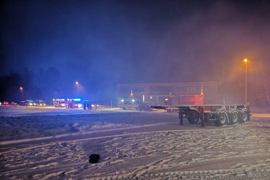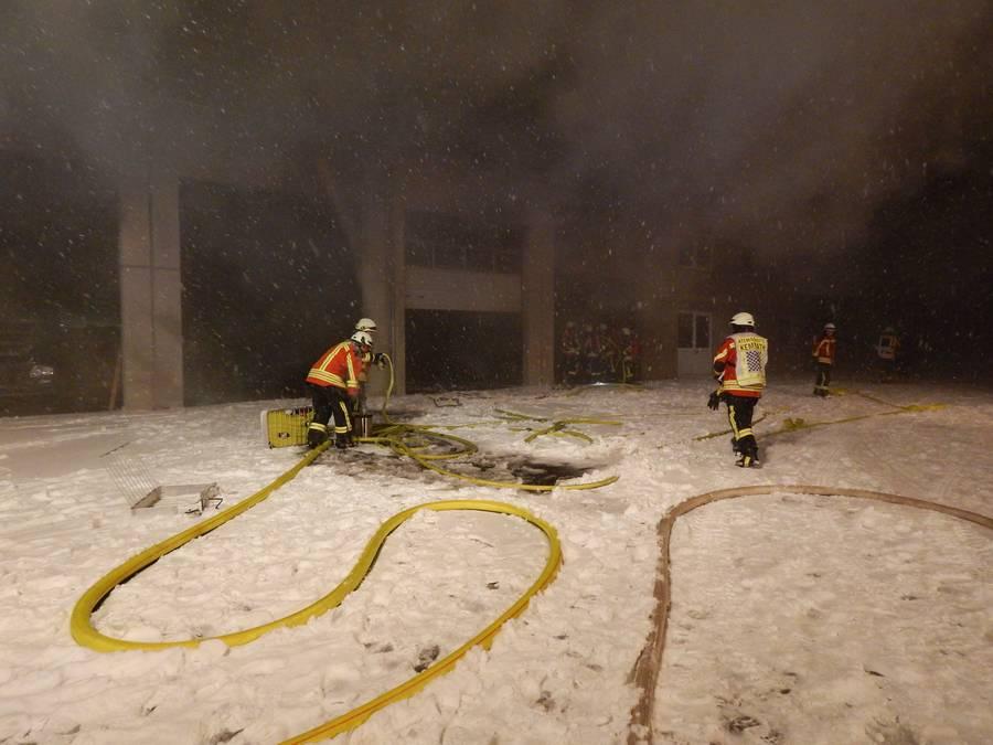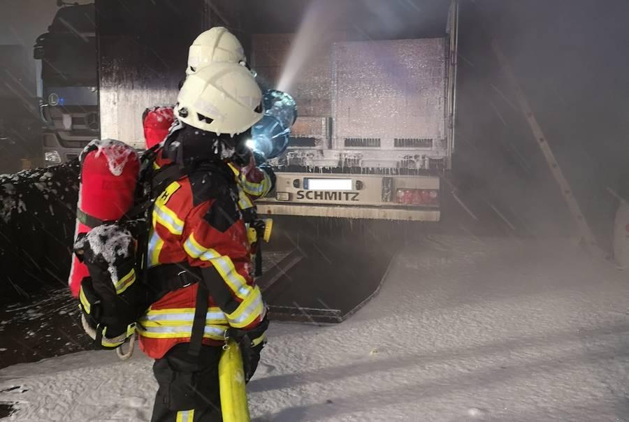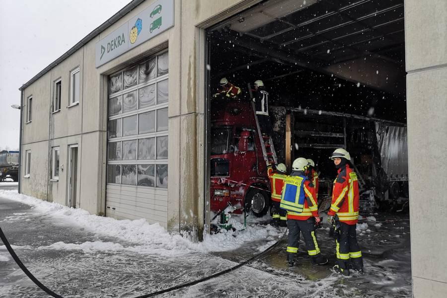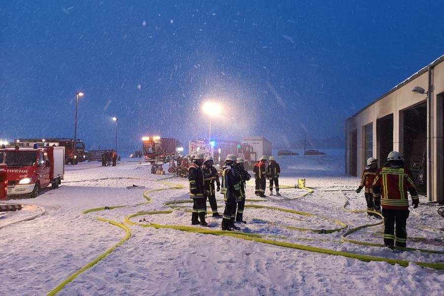 Der Brand eines Lkw-Gespannes in der Halle eines Speditionsbetriebes im Kemnather Gewerbegebiet am Samstagmorgen, 19. Januar 2019 sorgt für hohen Sachschaden. Rund 140 Rettungskräfte waren stundenlang im Einsatz.