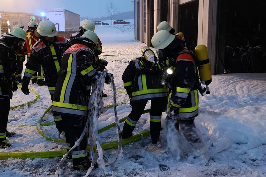 Umgehend leiteten die ersteintreffenden Feuerwehreinsatzkräfte aus Kemnath die Brandbekämpfung ein, bei welcher gleich zu Beginn zwei Atemschutztrupps mit zwei Rohren eingesetzt wurden. Dichter Rauch und extreme Hitze erschwerten die Erstmaßnahmen. Durch das zügige Öffnen von Toren der Halle konnte die Sicht der Atemschutzkräfte verbessert werden. Einzelne Hallentore waren zu diesem Zeitpunkt durch die Hitze bereits deformiert. „Da Anfangs unklar war, welche Stoffe oder Gefahrstoffe in der Halle gelagert oder auf den Lkw´s geladen sind, gingen die eingesetzten Atemschutztrupps unter größter Vorsicht und in Deckung vor.“, berichtet Kommandant Peter Denz.